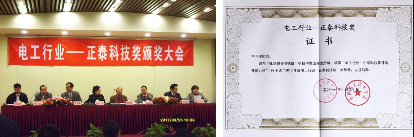 2011年3月25日,2010年度“電工行業(yè)——正泰科技獎”頒獎大會在北京中國科技會堂舉行。我公司董事長、總經(jīng)理王兆連以其率領(lǐng)團(tuán)隊(duì)在研發(fā)超導(dǎo)除鐵器上的貢獻(xiàn)獲此殊榮。