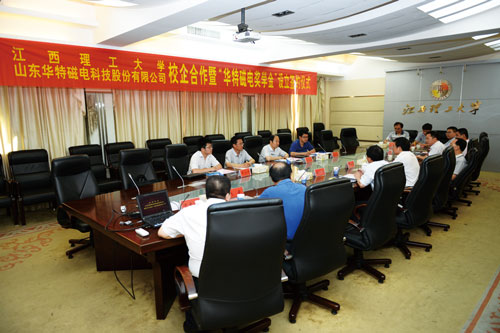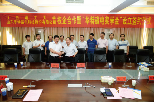 6月30日上午,公司董事長兼總裁、磁電聯(lián)盟理事長王兆連、技術(shù)總工程師賈洪利等一行4人到江西理工大學(xué)洽談校企合作事宜,并簽訂校企戰(zhàn)略合作協(xié)議和捐資華特磁電獎(jiǎng)學(xué)基金協(xié)議。江西理工大學(xué)校長羅嗣海、副校長溫和瑞、楊斌以及黨辦校辦、研究生院、學(xué)工部、對外聯(lián)絡(luò)與合作處、科技處、資環(huán)學(xué)院相關(guān)負(fù)責(zé)人出席了簽約儀式。簽約儀式由溫和瑞副校長主持。