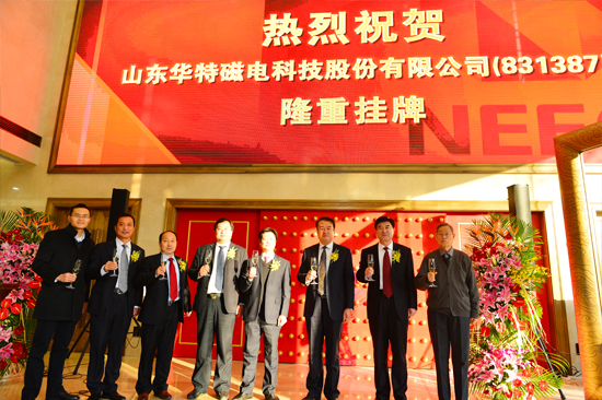 12月8日上午,山東華特磁電科技股份有限公司“新三板”掛牌儀式在全國(guó)中小企業(yè)股份轉(zhuǎn)讓有限責(zé)任公司隆重舉行。濰坊市金融工作辦公室副主任張新華、臨朐縣委常委、常務(wù)副縣長(zhǎng)衣利民、臨朐縣金融工作辦公室主任高凌利、臨朐縣城關(guān)街道黨工委書(shū)記沈明新、臨朐縣東城街道黨工委書(shū)記孫傳坤、山東華特磁電科技股份有限公司董事長(zhǎng)王兆連及公司股東和高管、臨朐縣相關(guān)企業(yè)負(fù)責(zé)人出席本次掛牌儀式。