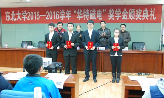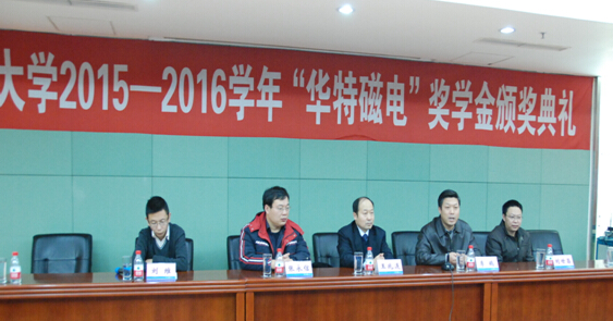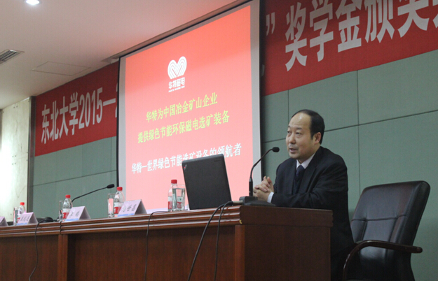 2015年12月25日,東北大學(xué)“華特磁電”獎學(xué)金頒獎典禮于東北大學(xué)漢卿會堂舉行,這是自去年設(shè)立華特獎學(xué)金以來第二次頒獎。公司董事長兼總裁王兆連、技術(shù)中心電器部經(jīng)理劉世昌、電器工程師張永信,東北大學(xué)校友總會、校董會、基金會管理辦公室主任李鶴、資源與土木工程學(xué)院黨委副書記兼副院長劉維、獲獎學(xué)生及礦物加工工程專業(yè)學(xué)生代表等參加了會議。