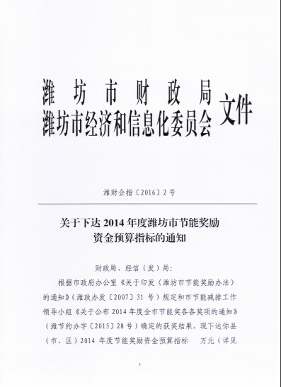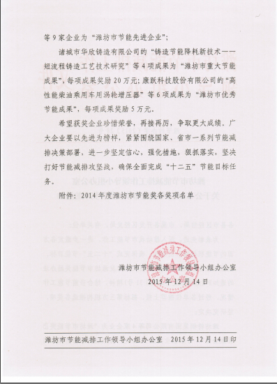 近日濰節約辦字[2015]28號文件和濰財企字[2015]28號文件下達了2015年度濰坊市節能獎的相關通知,我公司自主研發的發明專利產品提精降渣磁選機獲節能獎優秀節能成果,獎勵資金5萬元。此次獲評是對提精降渣磁選機的充分肯定,該產品與電磁淘洗機串聯使用成功代替了反浮選工藝,省去了藥物除硅環節,節能環保效益顯著。該產品項目2014年列入山東省科技發展計劃,2015年5月通過了新產品鑒定,技術達到國際領先水平,目前該產品已實現大批量產業化生產,年產200臺套提精降渣磁選機生產線項目已列入濰坊市重大謀劃項目。