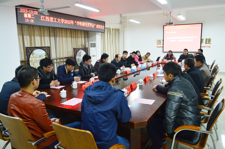 2015年12月29日,江西理工大學2015年度“華特獎學金”的在江西理工大學黃金校區逸夫實驗樓第一會議室舉行頒獎儀式,山東華特磁電科技股份有限公司董事長王兆連、濰坊新力超導磁電科技有限公司選礦實驗室主任付貴泰應邀出席,江西理工大學副校長伍自強教授、校團委書記、學工部副部長汪鋒鎖、研究生院院長助理陳龍泉、資環學院黨委書記楊建永、院長趙奎、院黨委副書記熊淑華、2015年度“華特磁電獎學金”的全體獲獎同學參加了本次儀式。