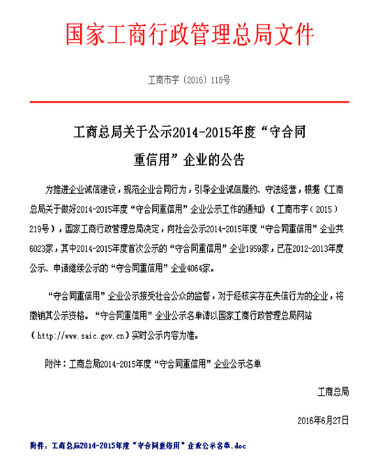 近日國家工商行政管理總局以工商市字(2016)118號發(fā)布了工商總局關(guān)于公司2014-2015年度“守合同重信用”企業(yè)的公告,華特公司名列其中。近年來華特公司積極推進誠信建設(shè),嚴(yán)格規(guī)范合同行為,誠信履約、守法經(jīng)營,得到了上級主管部門和客戶的一致好評,一直是山東省“守合同重信用”企業(yè),本次列入國家級“守合同重信用”企業(yè)是對公司規(guī)范化管理的肯定,將進一步推動企業(yè)的快速發(fā)展,促進企業(yè)向國際領(lǐng)先的磁力應(yīng)用系統(tǒng)服務(wù)商邁進。